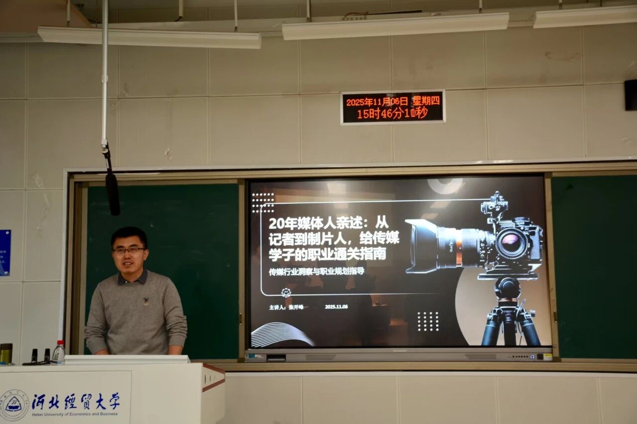 为精准指导大学生职业生涯规划,深入了解传媒行业人才需求,11月6日下午,新闻与文化传播学院于北三教A103室开展了“20年媒体人亲述:从记者到制片人,给传媒学子的职业通关指南”主题讲座。本次讲座特邀我院优秀校友、石家庄广播电视台《民生关注》栏目制片人张开峰担任主讲嘉宾,河北经贸大学新闻中心指导教师张惠瑀参加,院就业联络员张智主持。