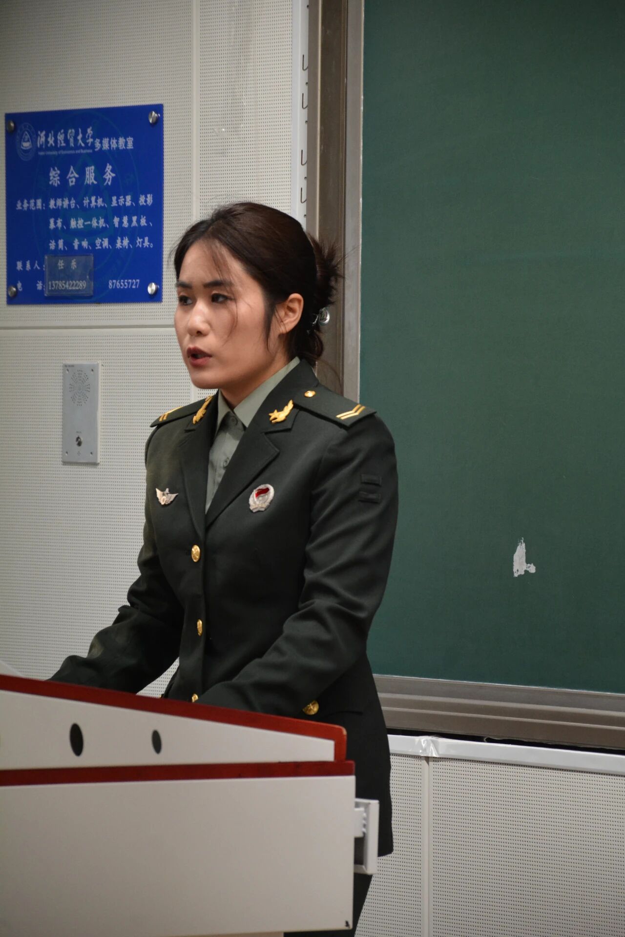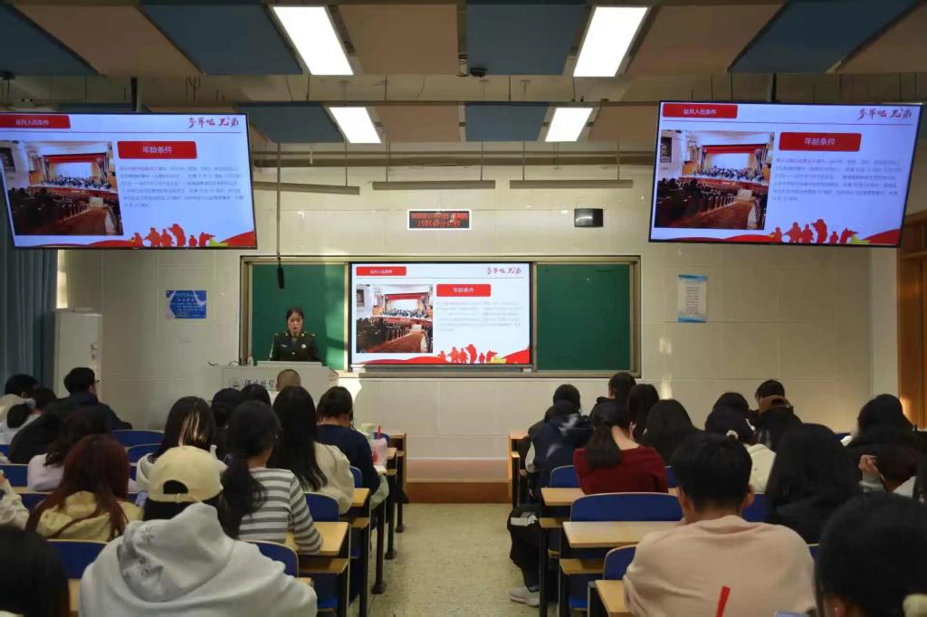 为厚植青年学子爱国情怀,搭建国防教育与征兵政策宣传桥梁,11月13日下午,新闻与文化传播学院特邀退伍军人任庆霞来到北三教A103教室,以“携笔从戎砺青春,建功军营谱华章”为主题举办了征兵宣讲会,院就业联络员张智主持,有志青年近九十人参会。